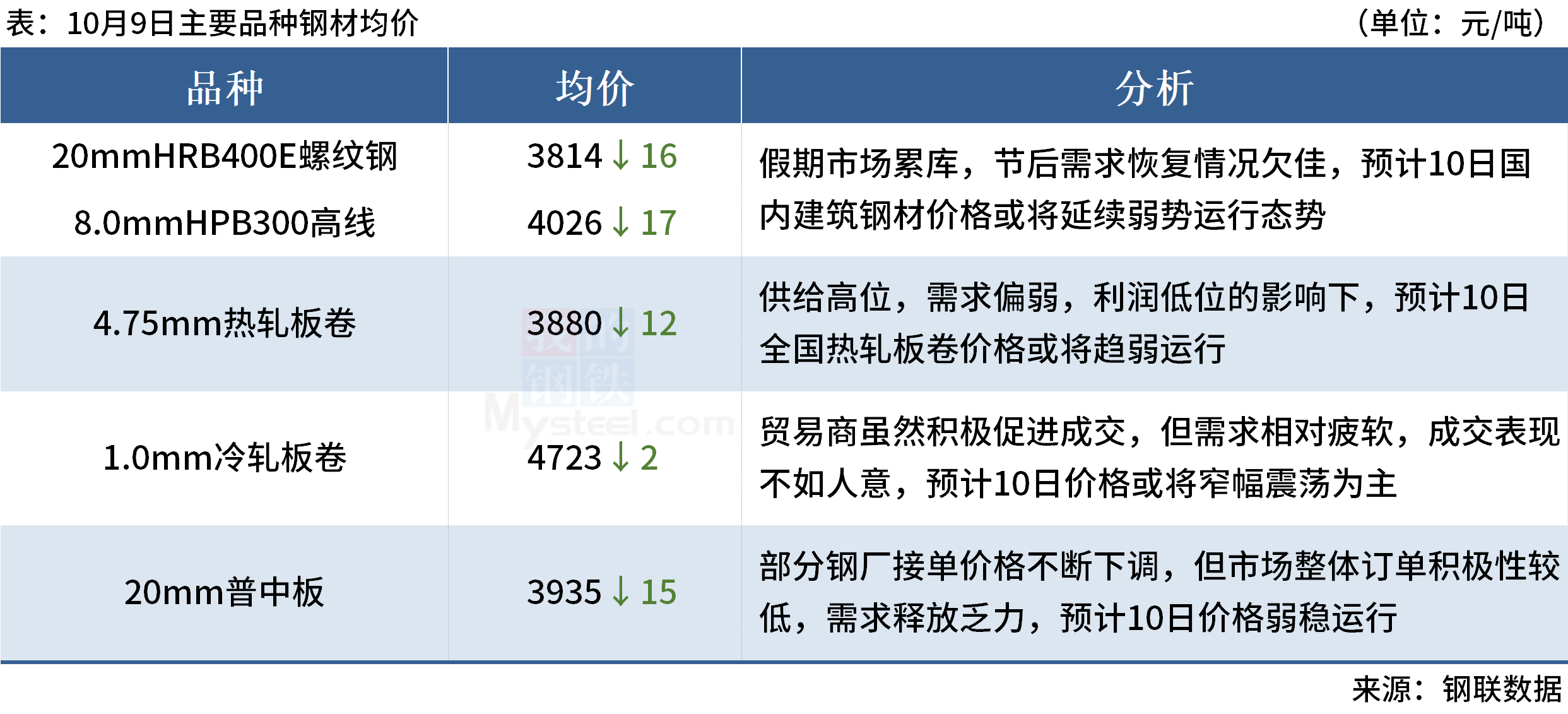 ◎10月9日,Mysteel统计40家独立电弧炉建筑钢材钢厂平均成本为3894元/吨,日环比下降9元/吨。平均利润亏损114元/吨,谷电利润亏损12元/吨。