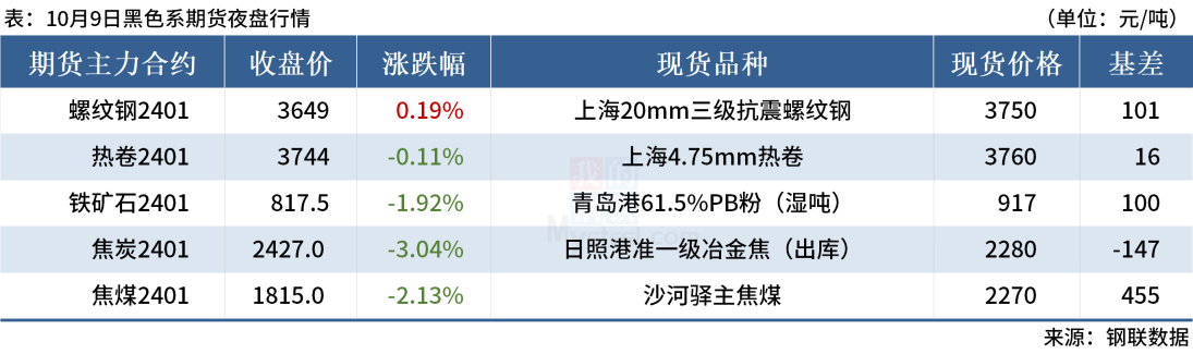◎10月9日,全国主港铁矿石成交72.50万吨,环比增21.8%;237家主流贸易商建筑钢材成交13.45万吨,环比减5.3%。
