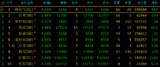 早盘收盘,国内期货主力合约多数下跌,液化石油气(LPG)、红枣跌超2%,菜粕、焦煤、菜油、尿素跌近2%,棉花、对二甲苯(PX)、沪镍、焦炭、PTA、玻璃、硅铁、短纤跌超1%。涨幅方面,集运指数(欧线)、碳酸锂、氧化铝涨超1%。