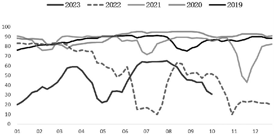 与此同时,旺季需求表现不佳,高频需求指标均处于近5年来同期最低,其中螺纹钢最新周度表需(同口径)为198.92万吨,同比下降23.2%。而9月全国237家贸易商建材成交量日均值为14.85万吨,同比降幅为17.5%,且国庆节后成交也无好转迹象。相应地,水泥出库率和混凝土出货量等指标也位于近年来同期低位,进一步佐证建筑相关品种需求表现疲弱。此外,基建方面,新增项目开工量有限,用钢需求增量不足,预计建筑钢材需求难有实质性改善,加之北方需求面临季节性走弱,后续螺纹钢需求依旧不乐观。
