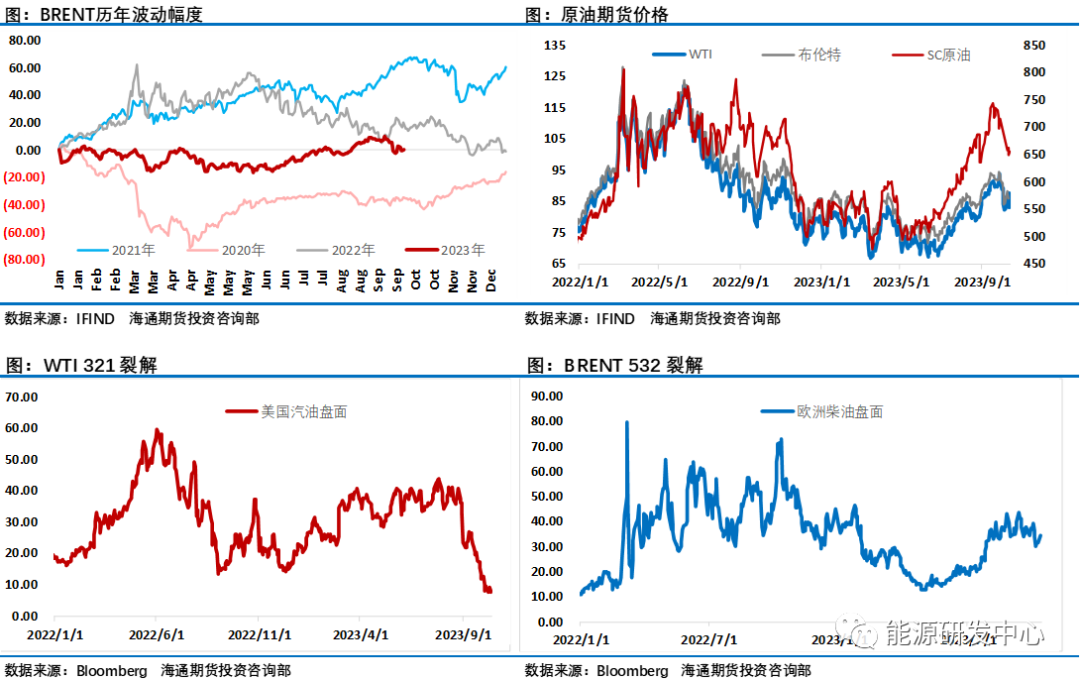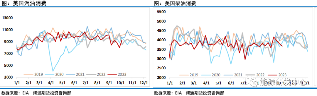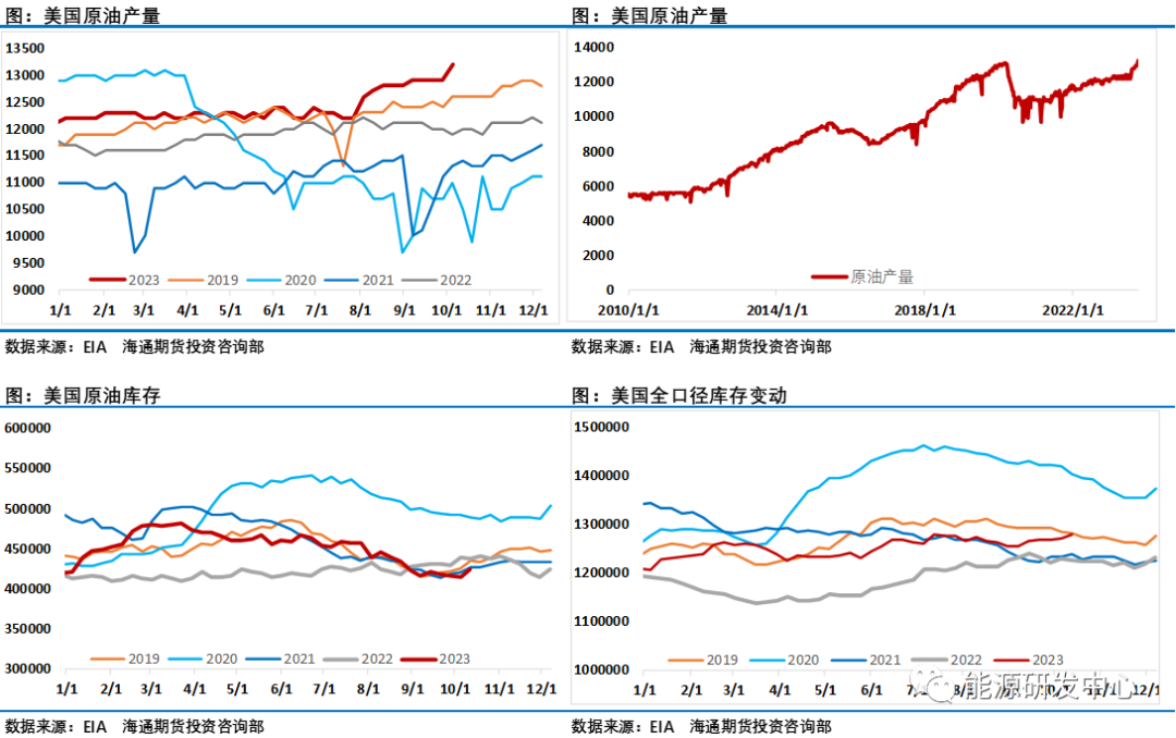 供应端数据显示由尼日利亚、沙特阿拉伯和科威特的增产推动,欧佩克原油产量在9月份增加了27.3万桶/日,达到2775万桶/日,另外IEA数据显示俄罗斯9月份的石油出口总量增加了46万桶/日,达到760万桶/日,其中原油出口增加了25万桶/日。对此俄罗斯副总理诺瓦克解释俄罗斯减少了石油和石油产品的出口,俄罗斯的欧佩克+承诺中包括石油产品出口。另外伊朗原油产量接下来的变化也是让市场高度关注,巴以冲突是否会影响到伊朗原油的供应是目前原油市场的一大变数,数据显示2023年伊朗的石油产出增速将仅次于美国,伊朗方面表示,目前伊朗的石油产量超过330万桶/天,伊朗石油部长表示,由于中东局势,预计油价将达到每桶100美元。另一个让市场感到意外的是美国原油产量数据,最新一期EIA周报显示10月06日当周美国国内原油产量增加30.0万桶至1320.0万桶/日。就在8月初美国原油产量仍然是1220万桶/日,但2个月的时间内这一数据迅速提升了100万桶/日到了1320万桶/日,这种收放自如的产出数据高效到让人羡慕,尤其是这个增产时点正发生在沙特自愿额外减产100万桶/日的背景下,供应端的博弈也耐人寻味。