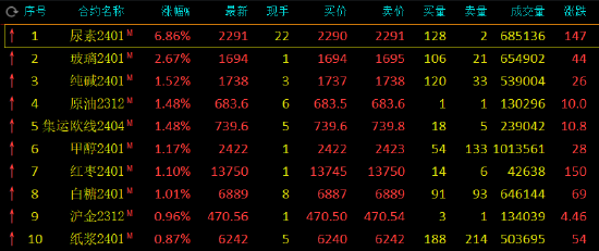 早盘收盘,国内期货主力合约涨跌不一,尿素涨近7%,玻璃涨超2%,纯碱、集运指数(欧线)、SC原油、甲醇、白糖、红枣涨超1%。跌幅方面,焦煤、焦炭、烧碱、工业硅、碳酸锂、20号胶、菜油跌超1%。
