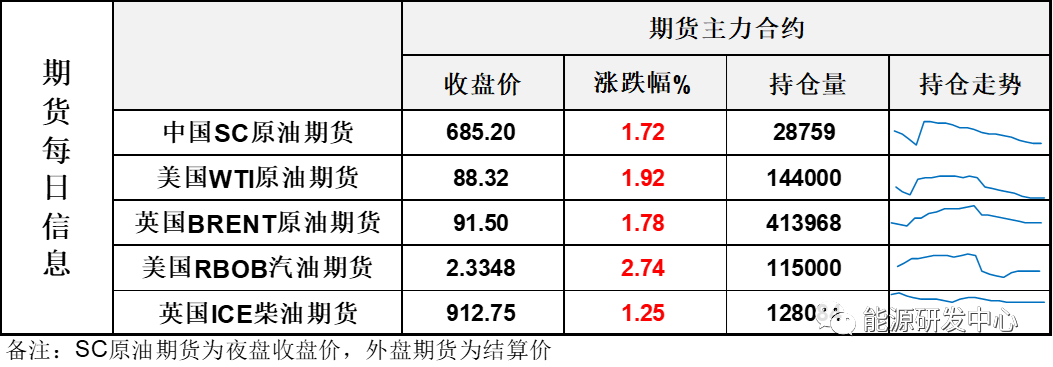 【1】WTI主力原油期货收涨1.66美元,涨幅1.92%,报88.32美元/桶;布伦特主力原油期货收涨1.6美元,涨幅1.78%,报91.5美元/桶;INE原油期货收涨1.72%,报685.2元。