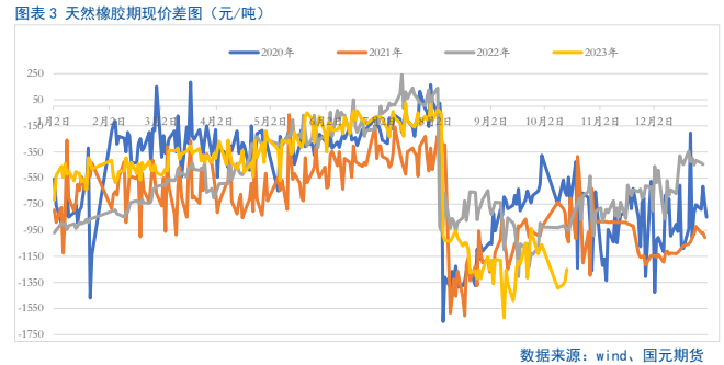 国庆节后第一周,橡胶板块领涨,天然橡胶、20号胶、合成橡胶期货集体走强,RU2401合约上周涨幅达到6.53%。主要是长假期间供应端受天气扰动,导致原料产出受限,叠加下游需求持续恢复,市场看涨氛围明显,胶价大幅上涨。步入本周第一个交易日天然橡胶价格高开低走,周二市场延续下滑局面,短期市场呈现回调,有进一步试探下方14500一线支撑的预期。由于前期期货市场的涨幅远高于现货,基差呈现大幅回落,远低于近几年同期。而近日期货市场略有降温,基差呈现小幅修复。