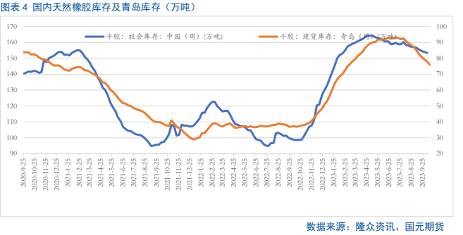 国庆节期间受天气扰动,主产区短期供给偏低。虽然已步入割胶旺季,但是国庆长期期间泰国主产区受不规律降雨困扰,割胶进度受到影响,导致泰国等地胶价持续走高,胶价反弹明显。叠加海外工厂推迟船期,国内标胶混合到港数量偏少,国内天胶库存持续去库提振业者心态。截至2023年10月8日,中国天然橡胶社会库存153.4万吨,较前一周下降0.7%,截至10月15日,青岛地区天胶保税和一般贸易合计库存量75.91万吨,较前一周下滑2.57%,位于5月底至今的低点。