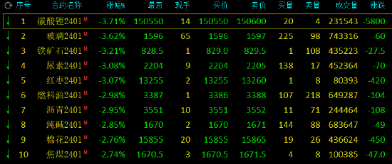早盘收盘,国内期货主力合约跌多涨少。碳酸锂、玻璃、铁矿石、尿素、红枣跌超3%,燃料油、沥青、棉花、焦煤、纯碱、纸浆、棉纱跌超2%。涨幅方面,集运指数(欧线)涨超2%,菜粕涨超1%。