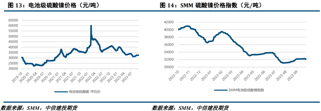 本周硫酸镍价格和硫酸镍价格指数小幅下跌。成本方面,9月MHP及高冰镍进口数量下滑,原料供应偏紧,对价镍盐格存在一定支撑。供应方面,厂家手中货源有限,供应方面偏紧,整体来说挺价意愿较强,不过部分厂家报价有所松动。需求方面,下游观望情绪较浓。总的来说,受益于成本支撑,硫酸镍价格存在一定支撑,但受需求疲软影响,或将出现回调。
