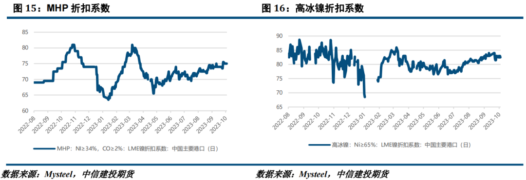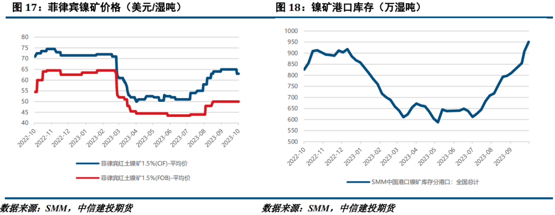 本周镍矿价格下跌。供应方面,2023年内将不再有新的RKAB签发,11月起开始审批2024年配额,RKAB有效期将延至三年,总的来看,虽然短期供应扰动仍在,但是长期担忧已经缓解。需求方面,终端不锈钢市场因需求疲软,近期开始减产,从而负反馈逐步向上。总的来说,短期政策担忧解除,负反馈持续向上,预计矿价震荡偏弱运行。