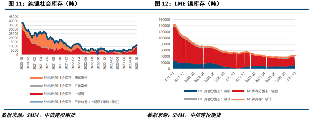 本周纯镍价格小幅下跌。宏观方面,避险情绪升温叠加美债收益率上行,商品板块受到抑制,美联储官员表态偏鸽,给予镍价小许支撑。成本角度看,转产电积镍成本平稳运行,但镍价跌幅明显,导致目前生产已陷入亏损,在原料端价格坚挺的情况下,镍价成本端受到一定支撑。供应方面,进口窗口持续关闭,俄镍散单进口动力不足,新增产能逐步释放。需求方面,受镍价超跌影响,下游备货需求较差,市场成交整体偏弱。库存方面,受供应放量、需求走弱等因素影响,纯镍社库继续累库,目前纯镍社库已攀升至10000吨以上,是一年多来的高点,LME库存亦走高,对镍价而言压力明显。总的来说,弱需求、库存高等多重因素对镍价形成了明显压制,但是当前价格下转产电积镍已经亏损,短期下行空间或有限,但过剩逻辑下镍价中期看依然偏空。