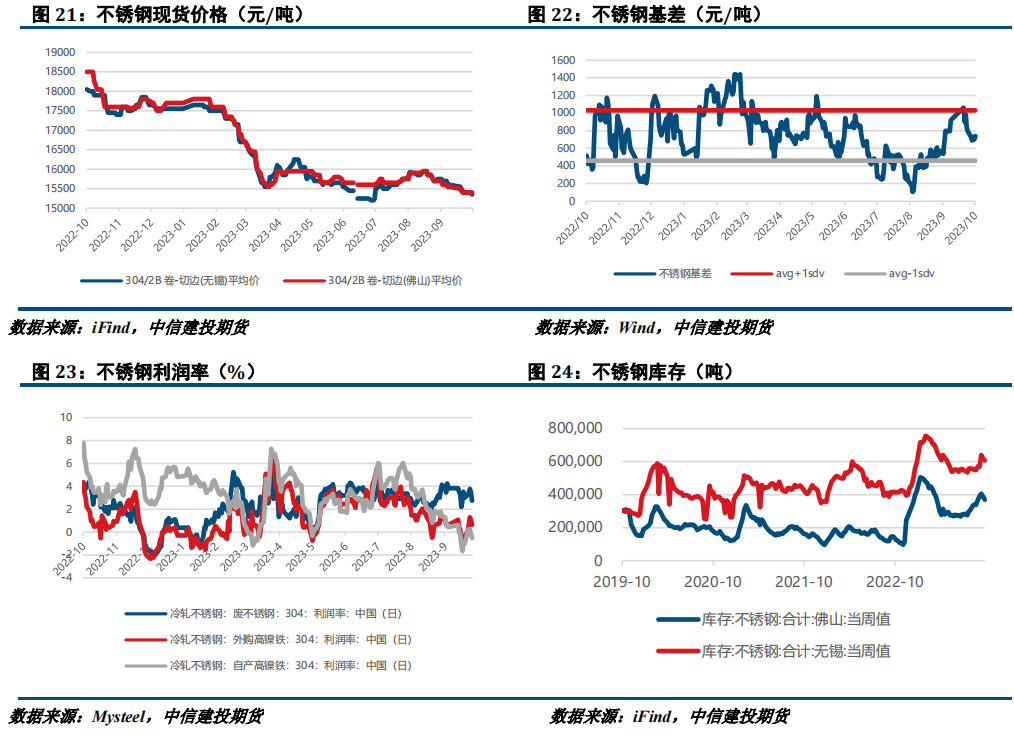本周不锈钢现货价格下跌。供应方面,旺季预期落空,钢厂减产动作加快,到货资源减少,供应逐步收紧。需求方面,成交氛围一般,出货多集中在低价资源。成本利润方面,受产业链负反馈影响,镍铁价格本周有所回落,但钢价跌幅更为明显,导致本周钢厂利润还是处于收缩的态势。库存方面,本期全国主流市场不锈钢78仓库口径社会库存继续降库,各个系别资源都有不同程度的消化。本周市场到货较少,由于成交氛围一般,现货行情走弱,出货多集中在低价资源,全国不锈钢社会库存有所消化。总的来说,不锈钢旺季预期落空使得需求短期看难有逆转,减产有所加剧,预计后市钢价震荡偏弱。