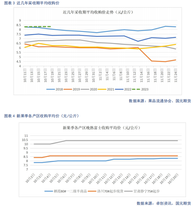 今年本果季新果开秤价较去年同比上涨0.5元/斤左右,在历年收购价中,也处于相对高位。开秤后,价格保持在高位平稳运行。本果季好货占比较少,贸易商为满足自身订单需求,收购前期积极挑拣好果订货,由于担心后期市场风险,对一般货较为谨慎,市场价格呈现两极分化。好货价格走势偏强,一般货在果农一定的惜售情绪支撑下,价格相对平稳,略有下滑,但交易量不大,许多果农被动入库。10月24日霜降过后,上市量将逐步增加,进入上市高峰期。前期好货货源被贸易商订购,加上部分上色较晚的条纹货上色欠佳,好货占比或有所下降。