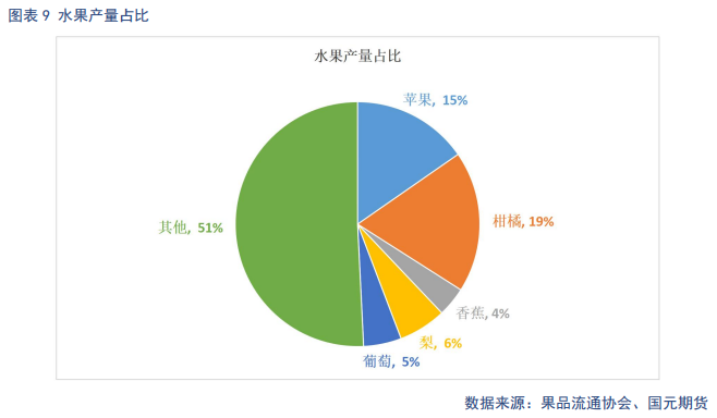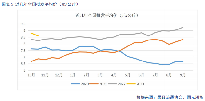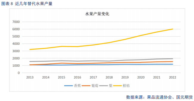 近几年,全国水果种植面积逐年增加。截止2022年,全国水果产量达 31296万吨,其中,柑桔增幅最快,产量达6003万吨,占比19%。其中柑桔、梨、香蕉和苹果的替代关系最强。柑桔、梨的生长周期与苹果相近,10月中旬,早熟类柑桔开始上市,由于柑桔类量大价廉,从消费替代角度来讲,今年苹果收购价较高,市场接受度不高,压制苹果价格上涨空间。