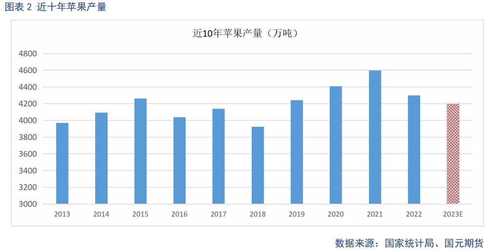 今年4月份,甘肃及陕北部分优生区遭遇霜冻灾害,正值花期,冷空气沉降下,川道下的果园受灾较严重。但经过几个月生长期的修复,产量比预期有所恢复,预计在4250-4300万吨左右,对比去年的产量基本持平。