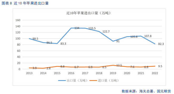 进口方面,近十年我国苹果进口量基本在10万吨上下,对比我国产量,影响甚微。出口方面,22年我国鲜苹果出口量共计约82万吨左右,处于历史最低位,主要因为22年果季产量不大,国内需求旺盛导致。截止23年8月底,我国苹果出口量为42.38万吨,其中23年8月鲜苹果出口量约为7.11万吨,环比增加79.25%,同比增加38.35%。鲜苹果出口有季节性规律,8-12月早熟开始上市,紧接着晚熟下树,适合出口的货源供应量增加,四季度苹果整体出口量会有所增加。