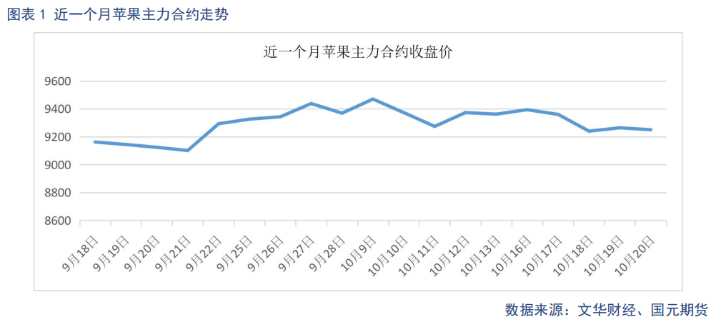 受上色进度影响,上市时间推迟,上周市场供货量逐步增加,价格两极分化,客商对好货采购积极性较强,好货价格走强。对一般货价格接受度不高,果农有一定惜售情绪,采购谨慎,一般货价格平稳略有下滑。上周,苹果主力合约最低9160元/吨,最高9440元/吨,收盘价9250元/吨,单周跌幅-1.2%,整体偏弱震荡。