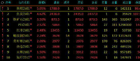 早盘收盘,国内期货主力合约多数上涨。焦煤涨超5%,焦炭涨超4%,铁矿石涨超3%,PTA、红枣、螺纹钢、热卷、菜粕涨超2%。跌幅方面,低硫燃料油(LU)、SC原油、集运指数(欧线)跌超2%,液化石油气(LPG)、生猪跌近2%。