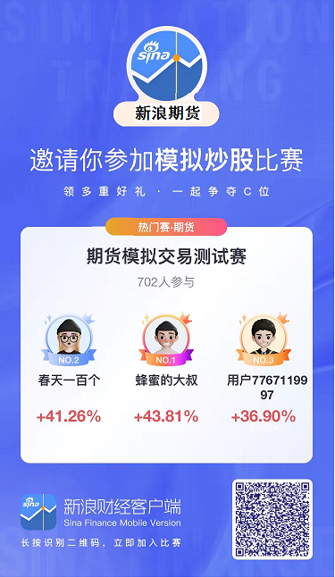 赛事主办方会围绕本次赛事定期开展丰富的奖励活动,在排名比拼之余,让参与者从更多维度参与其中,活动内容将在新浪财经期货频道及新浪期货微博实时更新。