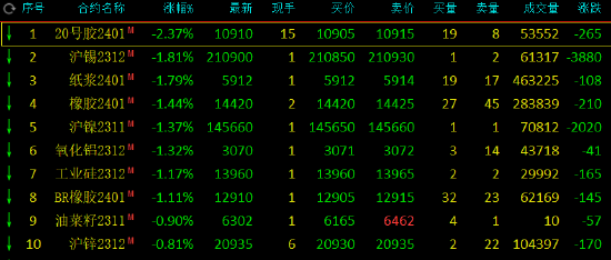 早盘收盘,国内期货主力合约涨跌不一。沥青涨超2%,豆二、碳酸锂涨超1%。跌幅方面,20号胶(NR)跌超2%,沪锡、纸浆、橡胶、沪镍、氧化铝、工业硅、丁二烯橡胶(BR)跌超1%。