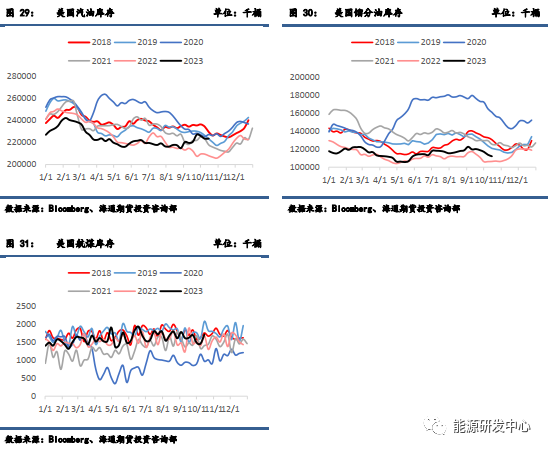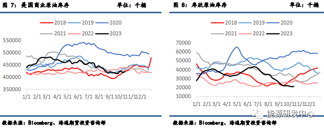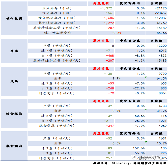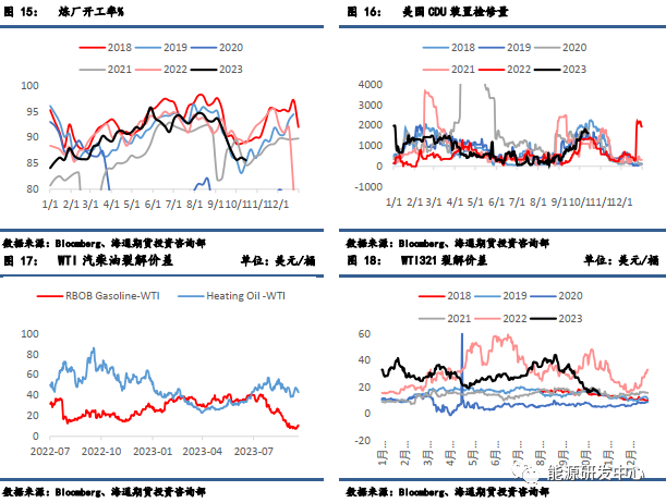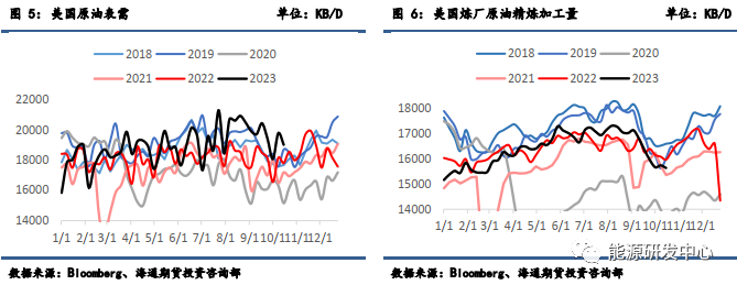 需求方面,美国原油表需有小幅下降,仍然高于历史同期平均水平。同时,炼厂角度的加工量环比也有小幅减少,整体需求端变化不大。