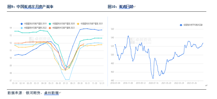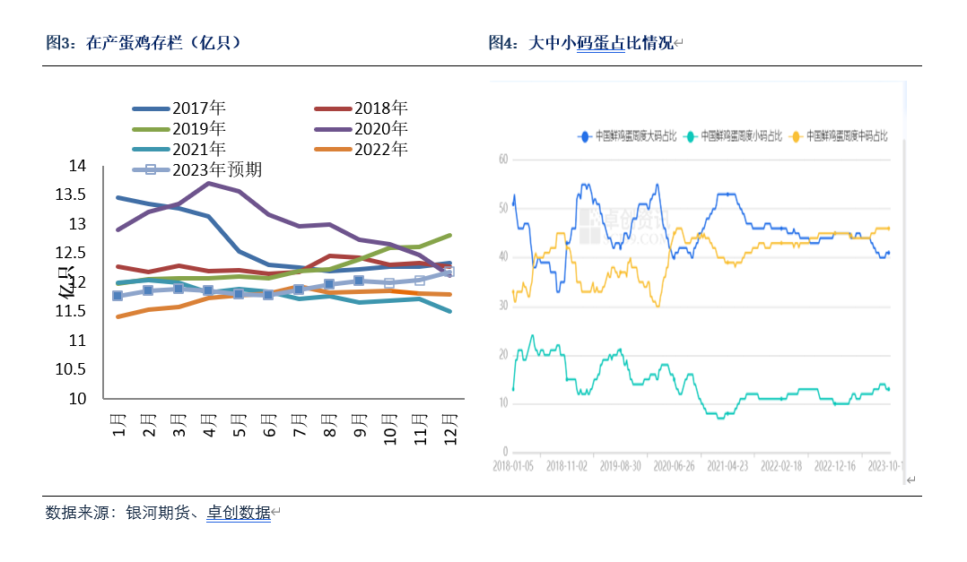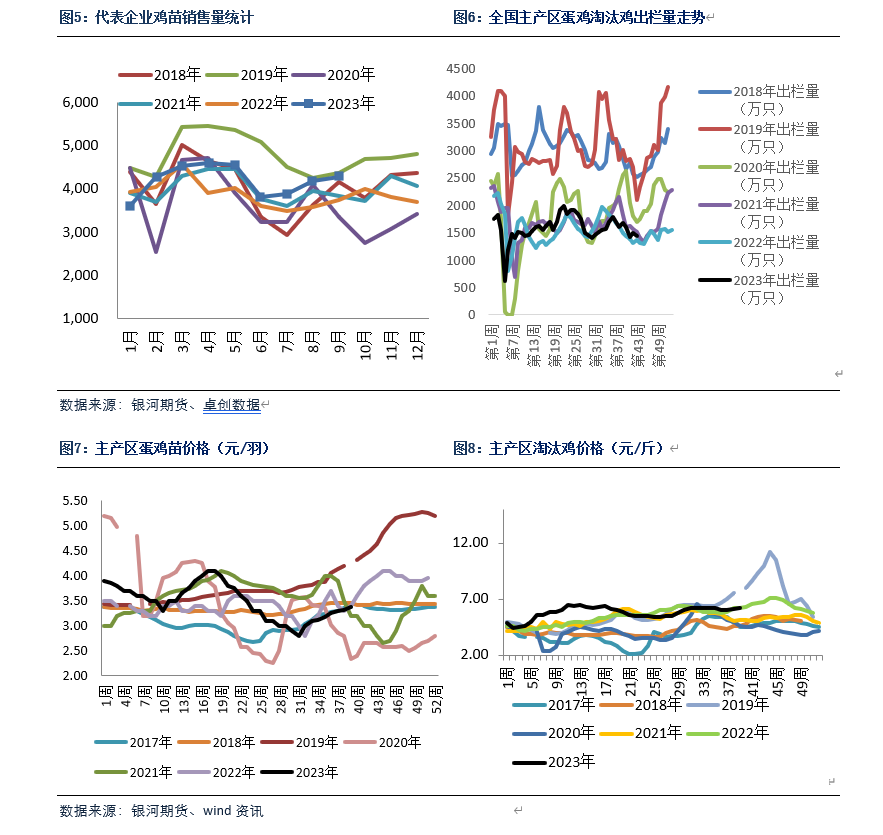 存栏及推演情况:根据卓创数据,9月份全国在产蛋鸡存栏量为12.03 亿只,环比增加0.5%,同比增加1.6%,低于预期。不考虑延淘和集中淘汰的情况下,根据之前的补栏数据可推测出,2023年10月份和11月份在产蛋鸡的存栏大致量为11.99亿只和12.04亿只。