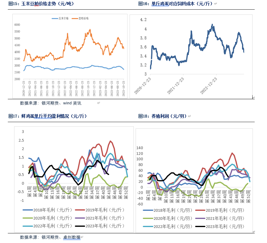 成本方面10月份玉米价格涨跌幅度不明显,豆粕现货价格的下降使得10月份饲料成本走弱,对鸡蛋价格支撑作用减弱。