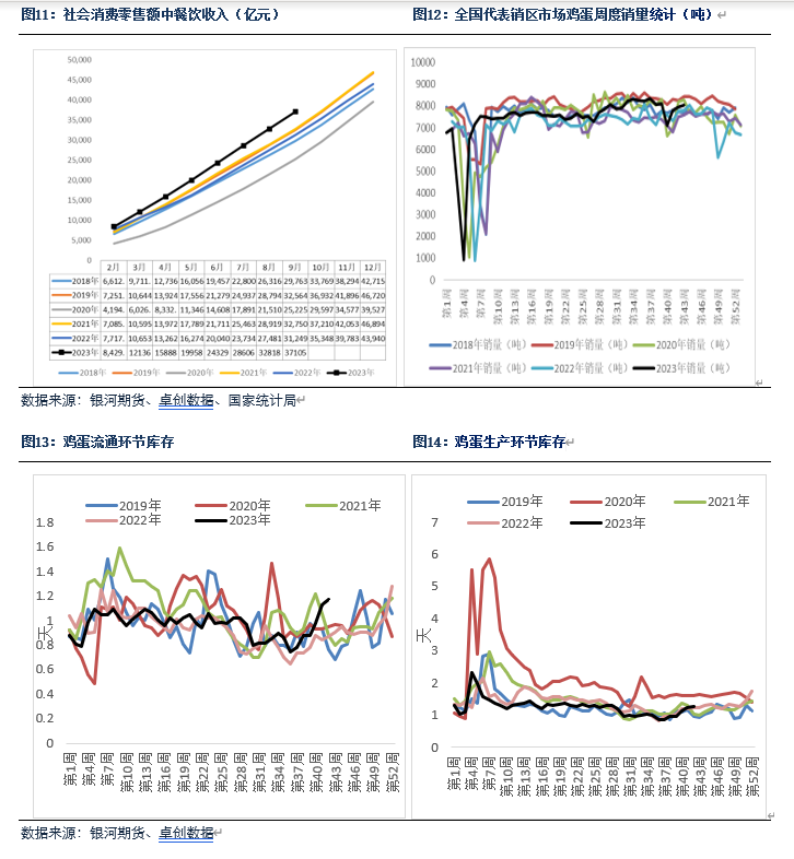 今年整体餐饮消费情况较好,对鸡蛋价格形成一定的支撑,预计11月份餐饮消费情况仍将继续维持。根据国家统计局的数据,9月份社会消费零售总额中餐饮业收入为4287亿元,同比增加了13.8%,2023年前9个月餐饮收入累计量为37105亿元,同比增加18.7%。
