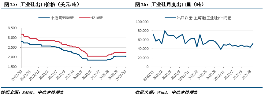 工业硅出口价格继续回调,海外工业硅需求依然延续疲软状态。在前期工业硅价格上涨过程中,海外采购需求有所激发,海关数据显示,2023 年9月中国金属硅出口5.13万吨,环比增加18%,同比增加4%。2023年1-9月中国金属硅出口共计43.03万吨,同比下降16%。