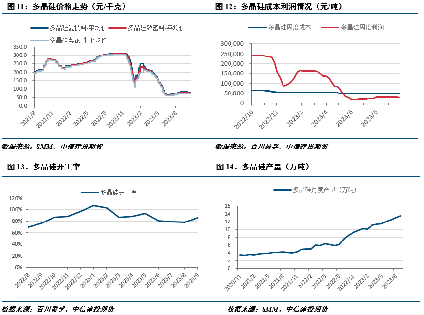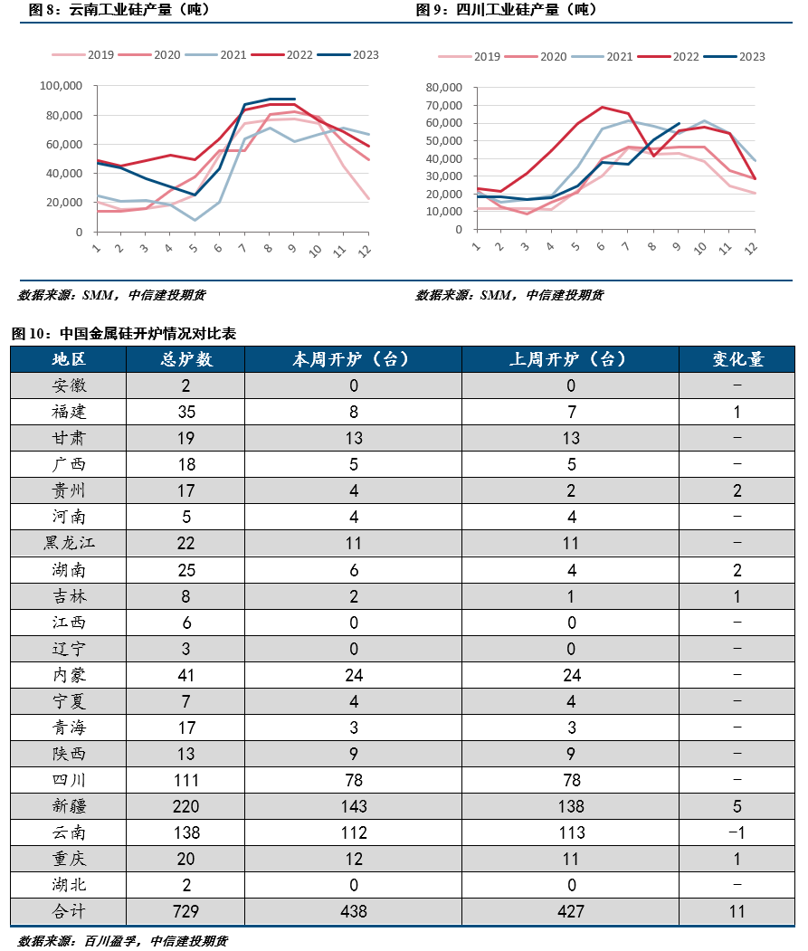 总结:本周工业硅期货呈先稳后跌的走势,在大厂复产扰动下,市场情绪低迷,现货报价亦持续下调,同时近远月合约价差再度拉大,仓单注销增多。从供需来看,供应端开炉数继续增加,月度产量大概率再创新高,同时下游需求暂无亮点,需求的主要拉动项多晶硅方面亦面临弱势局面。后市来看,当前工业硅供应充足,需求较为疲软,大量仓单流出,工业硅短期行情依然面临压力,后市重点关注枯水期西南硅厂停炉进度。操作上,逢高做空,SI2312合约参考区间13600-14300元/吨。