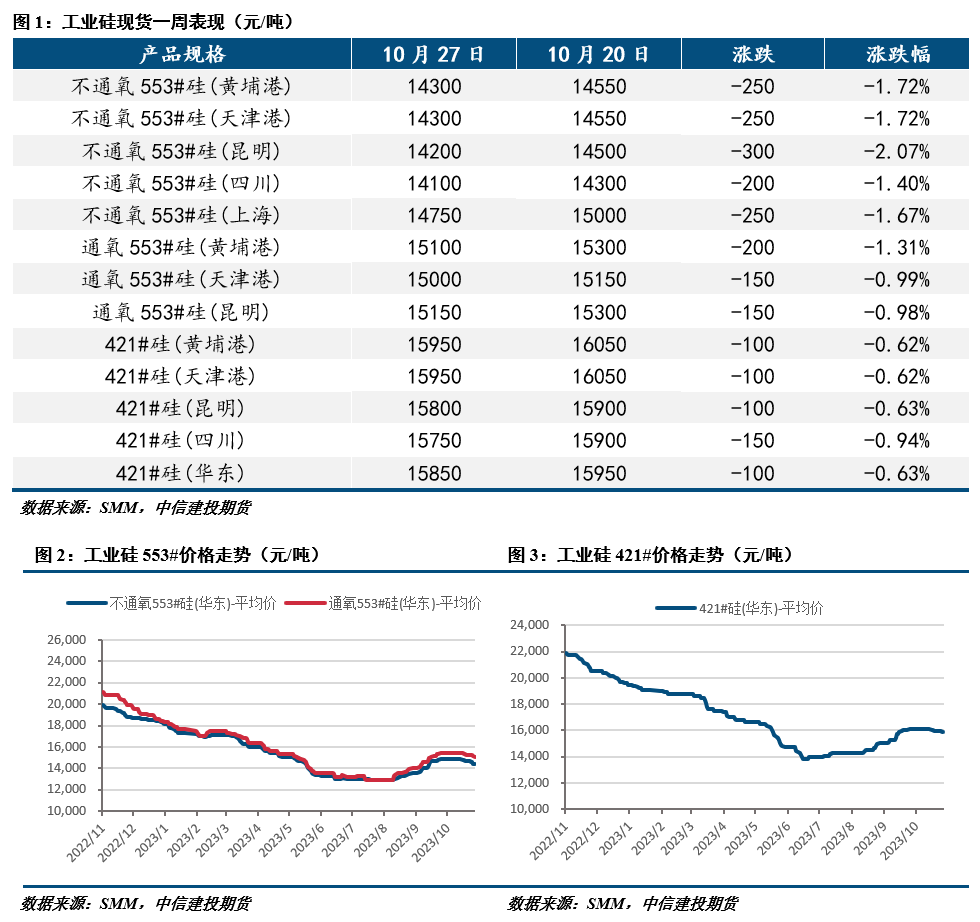 市场运行情况:前半周工业硅期货震荡运行,周四在大厂复产传言下开盘跳水,整周盘面表现弱势,11与12合约价差再度扩大。SI2312整周涨跌幅-3.12%,收于13995元/吨。现货市场方面,下游前期接单较多,西南硅厂在弱势行情下出货意愿较弱,现货市场颇为冷清,不过期货仓单持续出货,打压市场报价,叠加大厂复产传闻影响市场情绪,各牌号现货报价均有不同程度下行。
