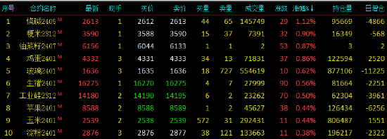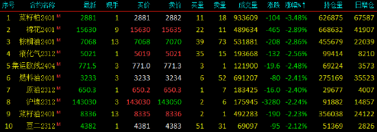 2023年10月31日,早盘收盘,国内期货主力合约多数下跌,菜粕跌超3%,棉花、棕榈油跌近3%,液化石油气(LPG)、集运指数(欧线)跌超2%。涨幅方面,烧碱涨超1%。