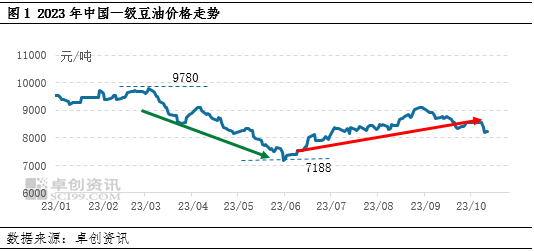 2023年中国豆油价格先跌后涨,价格重心较2022年下移。截至10月26日,2023年中国精炼一级豆油均价为8626元/吨,较2022年均价10744元/吨下跌2118元/吨,跌幅19.71%。年内最高点出现在3月3日,为9780元/吨,最低点出现在5月31日,为7188元/吨。供需格局宽松是导致价格弱势的主要因素,宏观及国际市场变化引发阶段内价格波动。