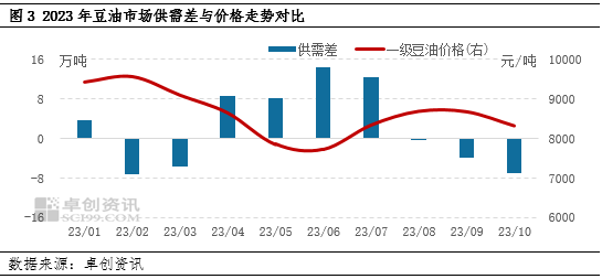 中国豆油市场价格驱动最根本的因素是国内供需基本面变化,宏观及国际市场因素会加剧价格变化的幅度。2023年1-10月豆油市场供需差一季度内供需差由正转负支撑价格高位波动,二季度后随着供需差由负转正且不断扩大,导致价格下跌,同时国际宏观利空影响加大了豆油下跌幅度。三四季度后,豆油供需差下滑,提振价格再度回升。(备注:供需差=月度产量-月度消费量)