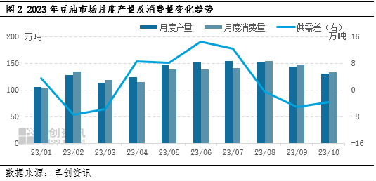 因中国豆油市场进口依存度较低,对国内供应端影响较小,因此供应端仅采取产量数据为依据。2023年1-10月卓创资讯监测的重点油厂豆油产量为1350万吨,较上年同期增加8.61%。年内产量增加的原因有两方面:一是年内大豆进口成本下降,油厂压榨利润好转,进口大豆积极性增强,进入油厂的原料增加,压榨量上升,因此豆油产出宽松;二是国内经济回暖,国内对油粕需求回升,刺激油厂压榨量增加。因大豆供应季节性因素,国内豆油产量在二三季度增加明显,一四季度有所下降。