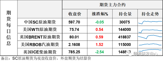 【1】WTI主力原油期货收涨0.41美元,涨幅0.54%,报75.74美元/桶;布伦特主力原油期货收涨0.47美元,涨幅0.59%,报80.01美元/桶;INE原油期货收跌0.05%,报597.7元。