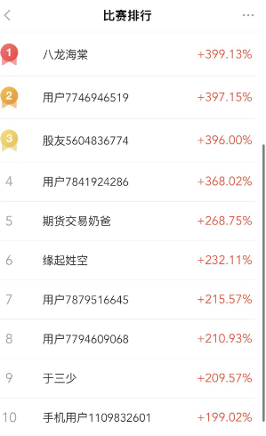 “第一届新浪期货模拟大赛”周赛第二期已结束,本周参与者收益率极其惊人,第一名“八龙海棠”周收益率达到了惊人的400%,而单周收益率超100%的多达30位参与者。