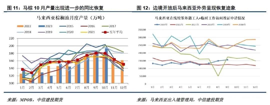 产量方面,194万吨的单月产量创出2018年以来的高点,同比增幅进一步升至6.8%,暗示马来西亚种植园劳动力改善的效果正在逐步显现。劳动力改善不仅体现于对旺产期单月产量高点约束的放松,还包括养护增加对产量的促进,该趋势的延续或在一定程度对棕榈油价格的趋势性转强时点带来一些推迟。