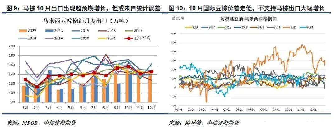 马棕10月出口数据亮眼,但或来自统计误差。船运机构预估的马棕9月出口在130万吨左右,但9月MPOB出口意外降至120万吨;船运机构预估的马棕10月出口在135-138万吨,10月MPOB出口则意外增至147万吨。综合9-10月出口来看,与船运机构的统计基本相近,暗示马棕10月出口大增或并非来自实际出口的显著好转,而更可能是统计船运机构和海关统计截止时间的差异,10月持续走低的国际豆棕价差也并不支持马棕出口大幅增长。