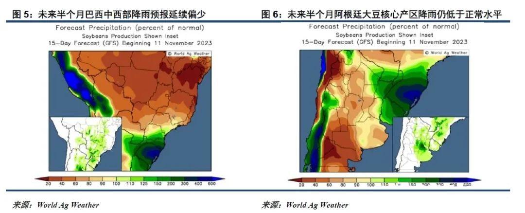 今年的厄尔尼诺带来南美典型的北旱南涝,巴西中西部及北部产区干旱,但南部却又过湿,对其播种进度带来不利影响,推迟上市节奏的同时引发市场对单产的担忧。在持续的高温干旱下,有消息称马托格罗索州有多达20%-25%的大豆需要重植,上周有机构开始下调巴西大豆单产至1.6亿吨下方,若当前干热天气延续至11月下旬,预计将有更多机构下调巴西大豆产量,那么2023/24年度南美大豆丰产预期兑现将面临打折的局面。