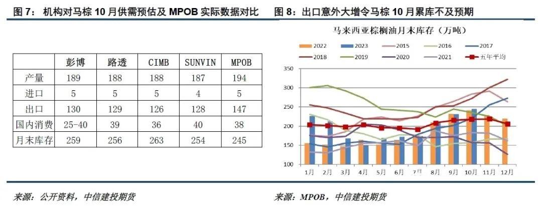 MPOB 11月报告迎来意外利好,出口超出预期,带来马棕10月的累库不及预期,提振短线棕榈油期价反弹。MPOB月报显示,马棕10月产量194万吨,环比增5.89%,略高于市场预期;出口147万吨,环比大增21.04%,显著超出市场预期;月末库存245万吨,环比增5.84%,低于市场260万吨左右的预估。
