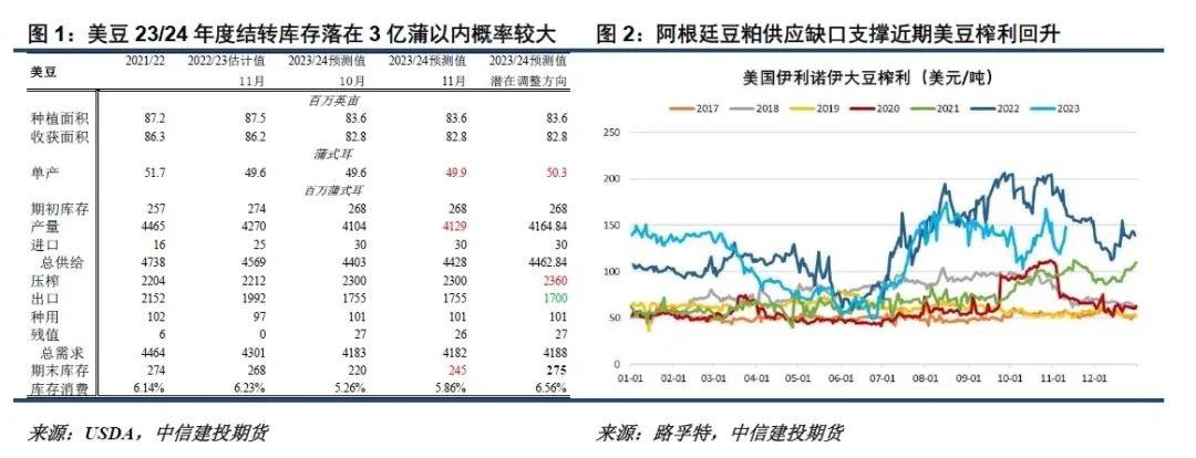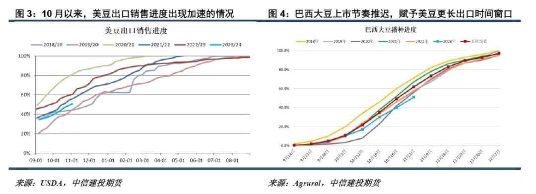 10月以来,随美国CNF升贴水重获优势及中国买需回归,美豆新作出口呈现一定加速状况。截至11月3日,美豆2023/24年度累计出口及未装船大豆数量2424万吨,较去年同期落后864万吨。上周以来USDA报告大单销售频繁,预计美豆出口销售有望获得进一步的提速。