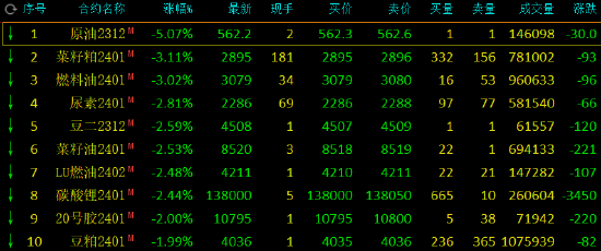 午盘收盘,国内期货主力合约跌多涨少,SC原油跌超5%,菜粕、燃油跌超3%,尿素跌近3%,豆二、菜油、低硫燃料油(LU)、碳酸锂跌超2%。涨幅方面,纯碱涨近4%,沪铅涨近2%。
