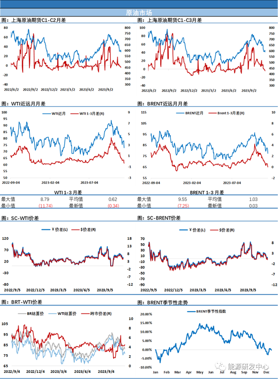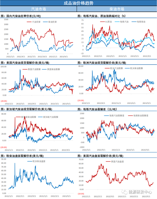 油价夜盘突然发力大跌,随着布伦特跌破80,WTI击穿75美元,SC原油更是持续破位大跌继续刷新低点,盘面止损盘出现,恐慌情绪推动油价不断扩大跌幅,虽然目前市场上并没有能推动如此大跌幅的明面消息,但显然资金还是感受到了危险的气息。原油成为了大宗商品中最弱的品种,连续多日领跌市场。油价结构不断走弱,SC、WTI原油近端已经均呈现贴水结构,暴跌同时布伦特近端也趋于贴水,疲态尽显,士气跌至冰点。汽油裂解差前期大幅回落后过去2周有所修复,柴油裂解差近期走弱。