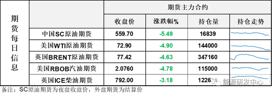 【1】WTI主力原油期货收跌3.76美元,跌幅4.9%,报72.9美元/桶;布伦特主力原油期货收跌3.76美元,跌幅4.63%,报77.42美元/桶;INE原油期货收跌5.49%,报559.7元。