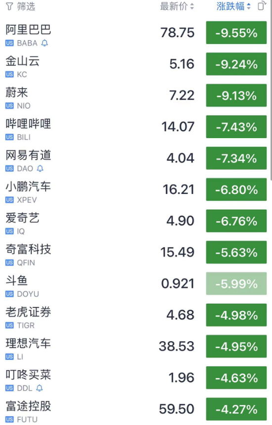 先来看美股,中概股盘中大跌,阿里巴巴一度跌近10%。