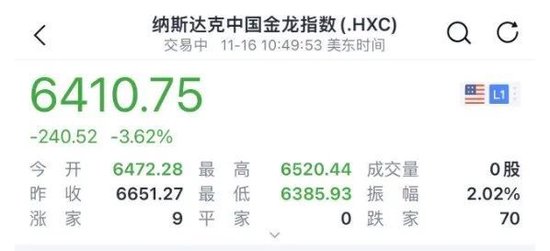 截至今晨收盘,纳斯达克中国金龙指数收跌近3.1%,阿里巴巴跌超9%,B站跌超7%,蔚来汽车跌近7%,小鹏汽车跌超6%,理想汽车跌超4%,腾讯粉单跌近4%,百度跌超3%,三季度营收增近12%符合预期的网易跌超2%,京东、拼多多跌超1%。