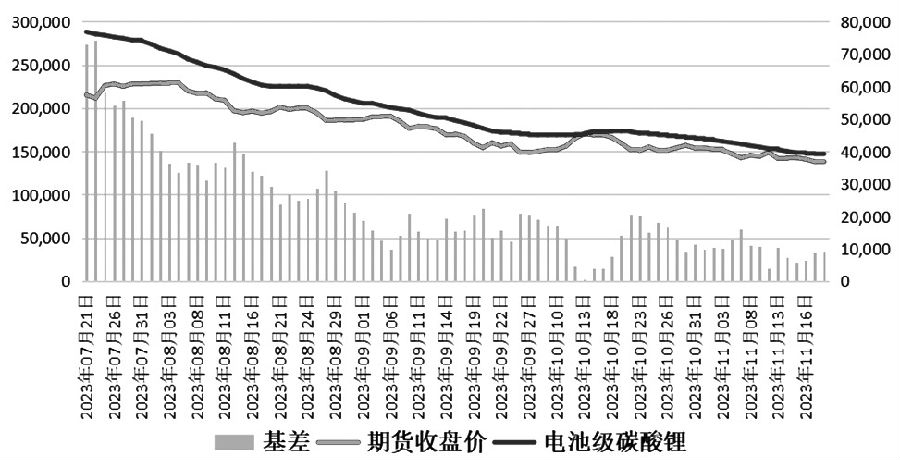 碳酸锂期货自上市以来价格一路下跌,截至2023年11月20日,碳酸锂主力2401合约已跌至137200元/吨,累计下跌幅度达36.22%。现货方面,根据上海有色网数据,11月20日,电池级碳酸锂日均价146500元/吨,相较于碳酸锂期货上市当日累计下跌49.13%,二者基差也从72900元/吨一路收缩至9300元/吨一线。