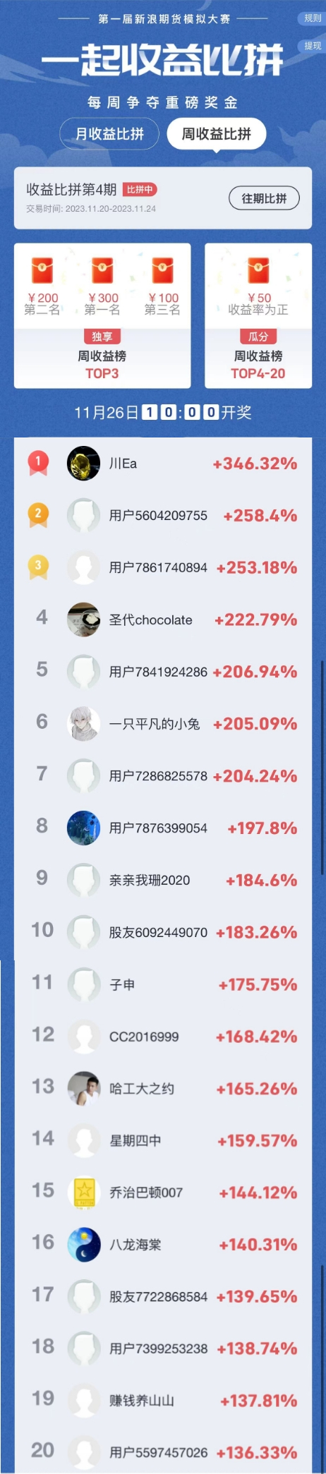 领奖方式可在微博话题 #第一届新浪期货模拟大赛#置顶位 或比赛首页下方找到。