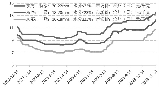 从历年红枣价格季节性特征看,红枣上市初期都会有一个提价过程,此阶段一般持续到11月中下旬至12月初。此阶段是红枣每年的采购旺季,前后分布在十一、双11、春节多个重要的节日,企业采购周期与下游居民消费周期重叠,因此,此时最为活跃,红枣价格也最易上涨。