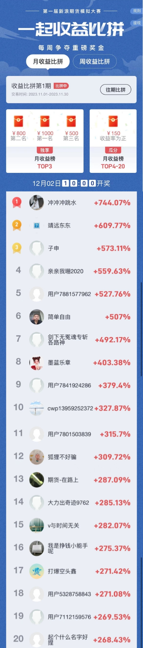 领奖方式可在微博话题 #第一届新浪期货模拟大赛#置顶位 或比赛首页下方找到。