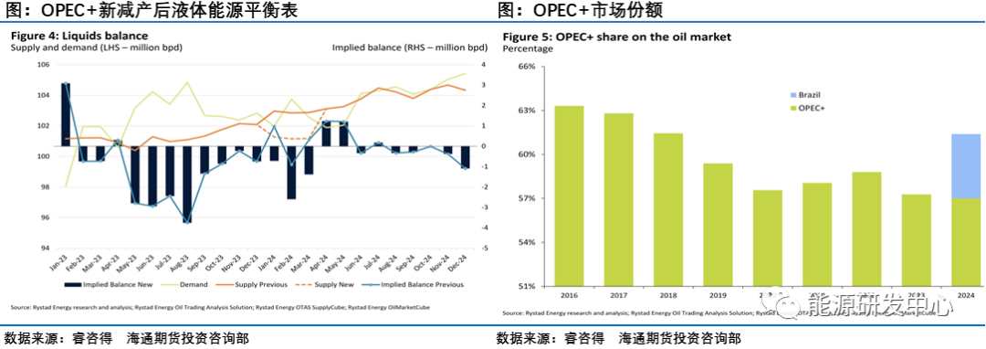 此次会议结果显示欧佩克+成员国们各自宣布在明年一季度期间“自愿”减产,总规模合计219.3万桶/日,其中沙特每天减产100万桶,其余国家的具体减产规模为:伊拉克减22万桶/日、阿联酋减16.3万桶/日、科威特减13.5万桶/日、哈萨克斯坦减8.2万桶/日、阿尔及利亚减5.1万桶/日和阿曼减4.2万桶/日,这一减产规模基本与去年4月份各国承担的减产任务相当。这样欧佩克+集团每天减少170万桶石油产量。此外,俄罗斯承诺将其自愿削减的出口量延长每天50万桶,其中原油为每天30万桶,产品为每天20万桶。这样欧佩克+减产规模就达到了200+166+219=585万桶/日的规模。原油市场平衡表也从会议之前的供应明显过剩转向供需偏紧局面。